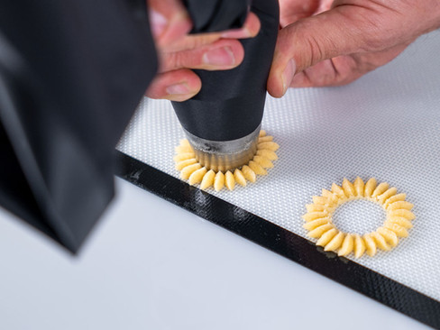 Il s’agit de la partie extérieure du biscuit : une pâte sablée légère et aromatique, dressée à la poche à douille pour obtenir une forme fine et élégante.