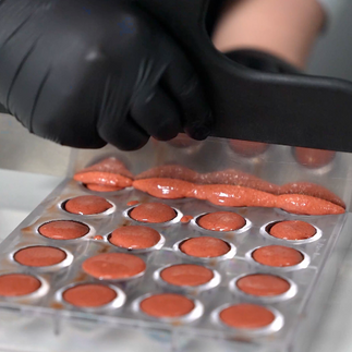 Versare la ganache in una sac à poche senza beccuccio, posizionare la sac à poche sul piano di lavoro e stendere con cura la ganache, muovendola finché la temperatura non scende a 26°C, quindi scaldare a 28°C con l'aiuto di una fonte di calore. pistola. Una volta raggiunta questa temperatura la ganache è pronta per essere distribuita nei gusci di cioccolato.