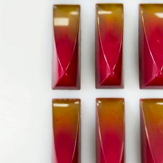 Spruzzare gli stampi con burro di cacao colorato di rosso, creare un guscio sottile con cioccolato fondente Cacao Barry Guyaqyuil Bitter 65% o un cioccolato fondente fluido 65-70%. Riempire per metà con gel di ciliegie raffreddato, quindi versarvi sopra il pralinato di pistacchio temperato, lasciando 1 mm per coprire con altro cioccolato fondente temperato una volta che il pralinato si è cristallizzato.
